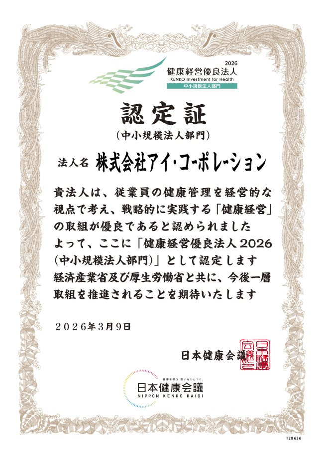 2026-04-10 「健康経営優良法人2026」に認定されました 株式会社アイ・コーポレーションは、経済産業省と日本健康会議が認定する「健康経営優良法人認定制度」より、中小規模法人部門における「健康経営優良法人2026 」の認定を受けました。